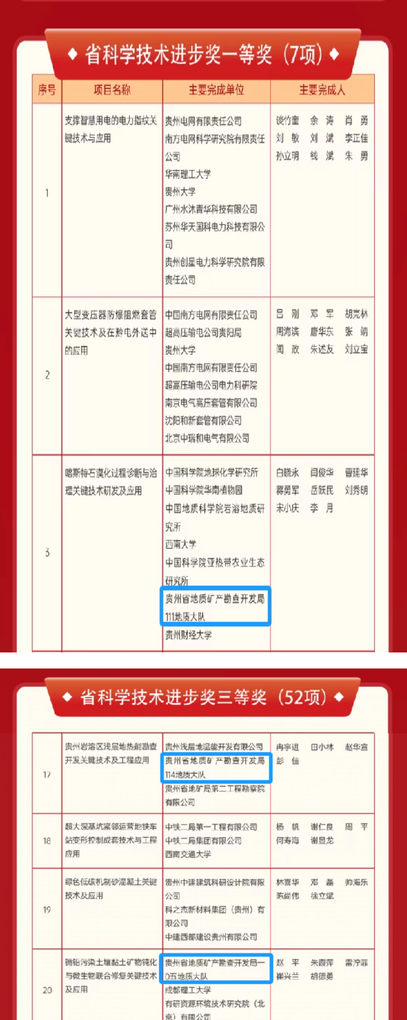 贵州省地矿院下属三家单位表现突出,共获3项奖励,包括一等奖1项、三等奖2项,彰显了该院在地质科研与应用技术方面的实力。